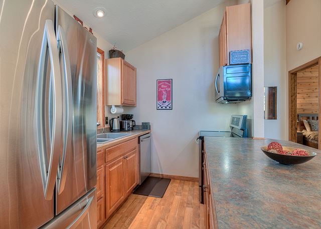 Full Kitchen, Refrigerator, Drip Coffee Maker, Microwave, Toaster, Cookware, Blender, Dishwasher, Pantry items, Oven, Kettle, Stove, Kitchen towels, Hot Pads, Hand Mixer, Can Opener, Air Fryer