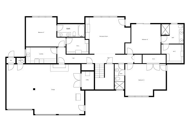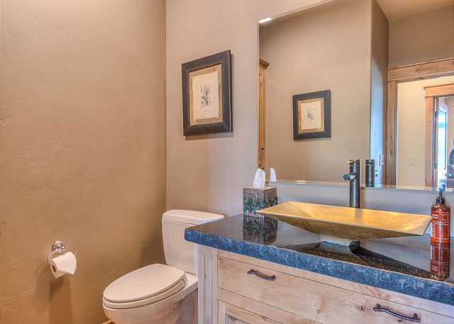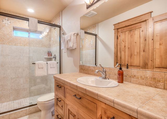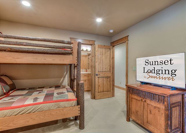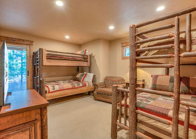 Downstairs features two additional king en suites for added privacy and convenience. One king master (listed as Bedroom #2 on the floor plan) has a private TV and features a full size wooden crib, for those family members who are traveling with an infant. The bathroom has a tub shower combo. The second downstairs king master also has a private TV with access to the downstairs deck. The en suite is equipped with a walk-in shower. The final bedroom has two pyramid bunk beds (twin/double), a private TV, and a jack’n’hall bathroom with a walk-in shower. This bedroom offers a fun and functional space for kids or additional guests, making this home an excellent choice for multi-family stays.