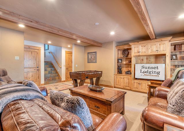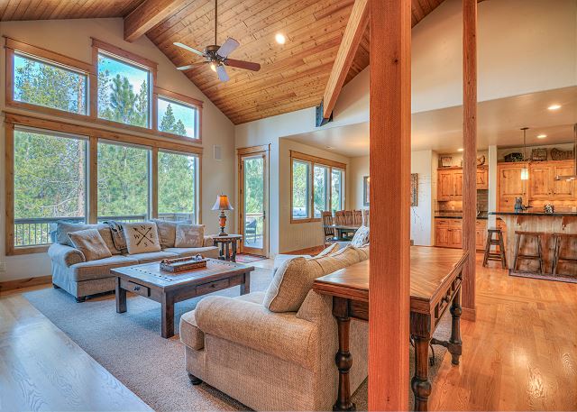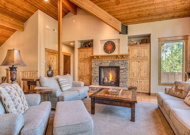 The interior features a split-level layout with refined finishes and an open, inviting atmosphere. The upper level serves as the heart of the home, where the living room, dining area, and fully equipped kitchen come together to create an ideal gathering space. Large windows invite in natural light, enhancing the warm and welcoming feel. Downstairs, a second living area provides additional space for entertainment, movie nights, or quiet downtime, making this home perfect for larger groups with varying schedules.
