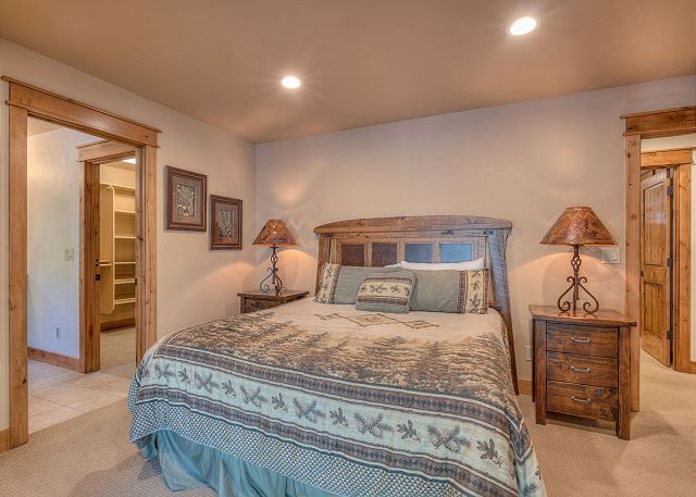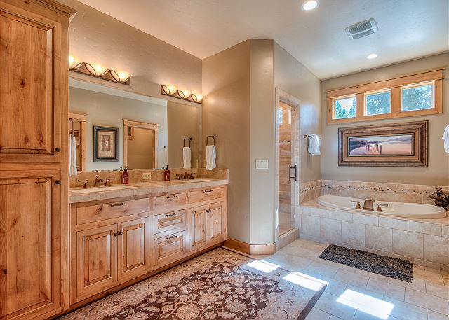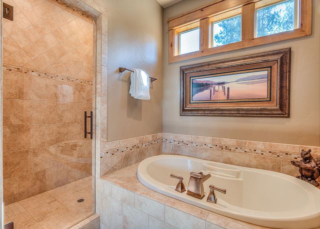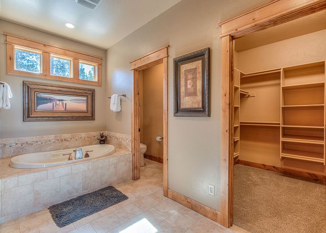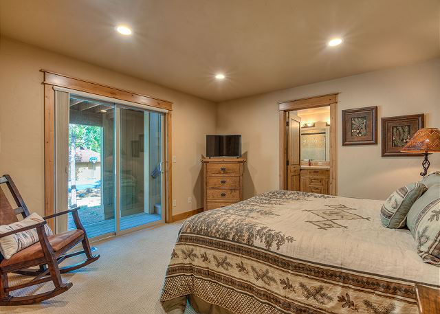 Wallowa 22 comfortably accommodates guests in four well-appointed bedrooms. The upstairs primary suite features a king bed, a TV, private access to the hot tub, and a stunning bathroom. The bathroom has a dual vanity, a large soaker tub, a beautifully tiled walk-in shower, and a huge walk-in closet.