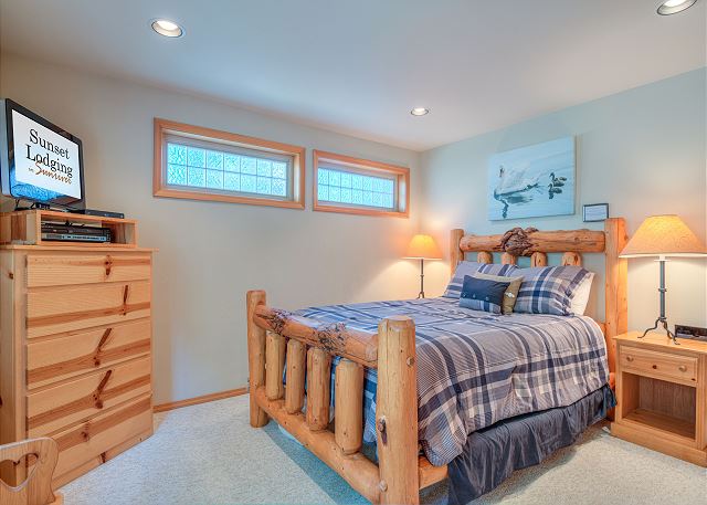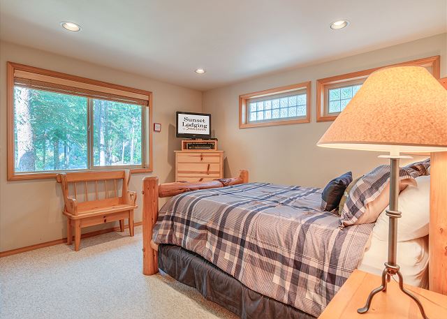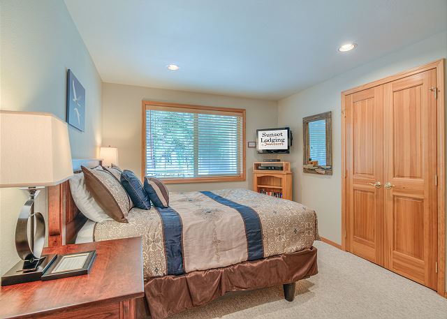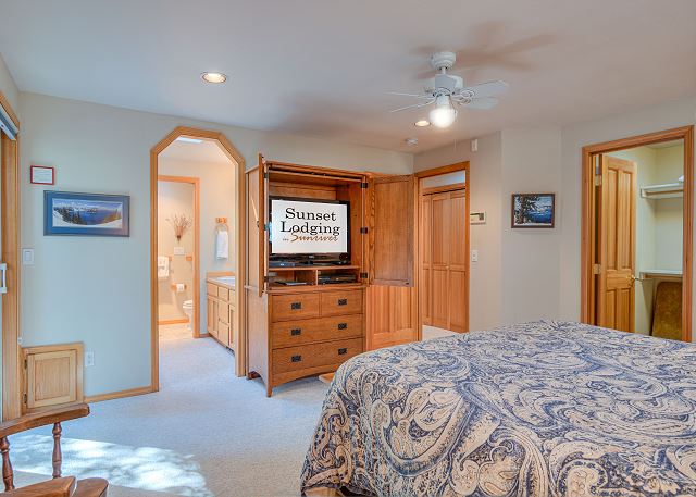 The king primary suite offers a peaceful retreat with a large walk-in closet and a private bathroom featuring a luxurious jetted Jacuzzi tub. Guests in the primary suite also enjoy direct access to the home’s private hot tub. The second bedroom includes a comfortable queen bed and television, while the third bedroom features a brand new queen bed, updated furnishings, and its own TV, providing comfortable accommodations for additional guests.