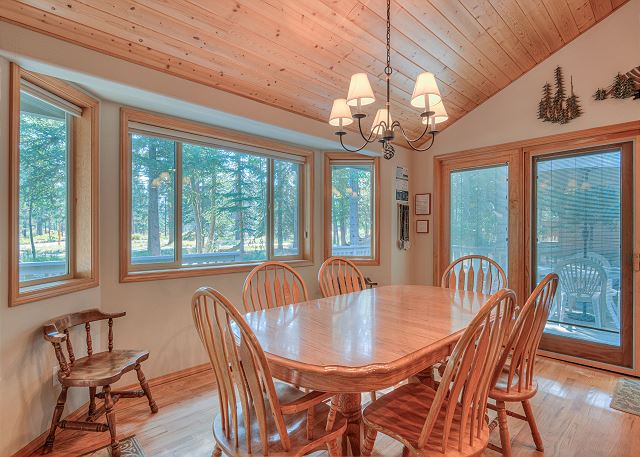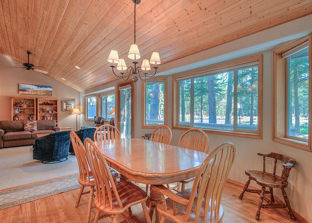 Step inside to a bright and inviting living room featuring a flat-screen TV, comfortable leather recliners, a large sleeper sofa, and a cozy gas fireplace. Large windows allow Sunriver’s year-round sunshine to fill the space, creating a warm and welcoming atmosphere. The living area flows seamlessly into the open dining space, providing the perfect setting for gathering with family and friends after a day of exploring Central Oregon.