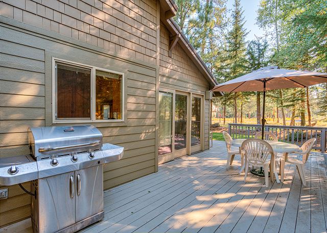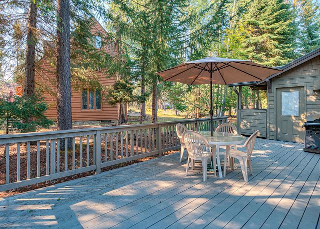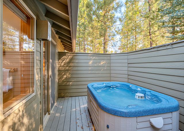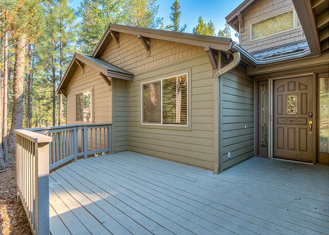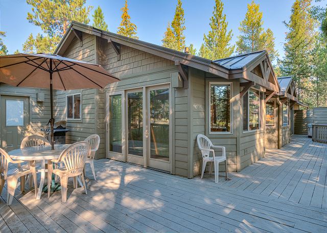 Outside, the enclosed wraparound deck offers a wonderful space to relax and enjoy Sunriver’s fresh mountain air. The deck includes comfortable outdoor seating, a gas BBQ grill, and overlooks a landscaped grassy lawn area. After a day of biking, hiking, or exploring Sunriver, unwind by soaking in the private hot tub under the Central Oregon sky, creating the perfect end to a day of adventure.