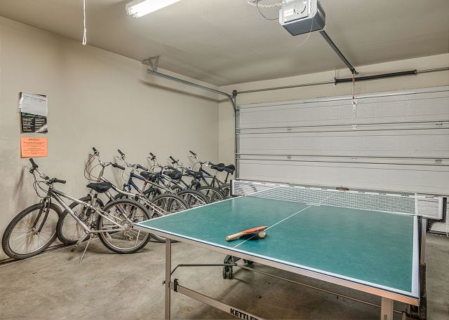 The garage provides bikes for exploring Sunriver’s extensive trail system as well as an indoor-outdoor ping-pong table for added entertainment.