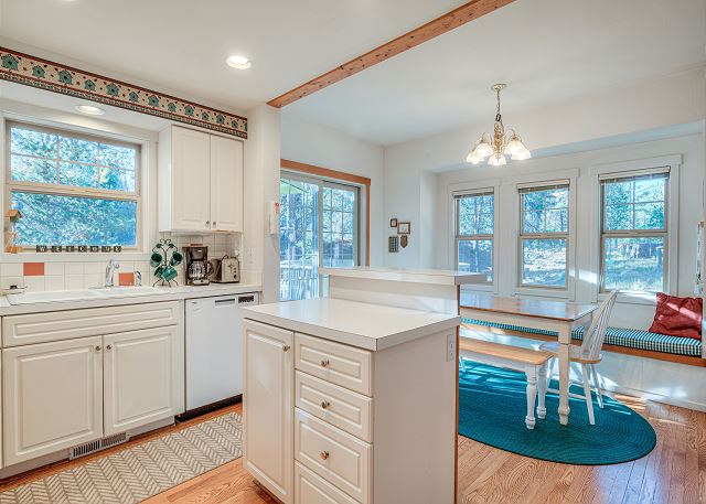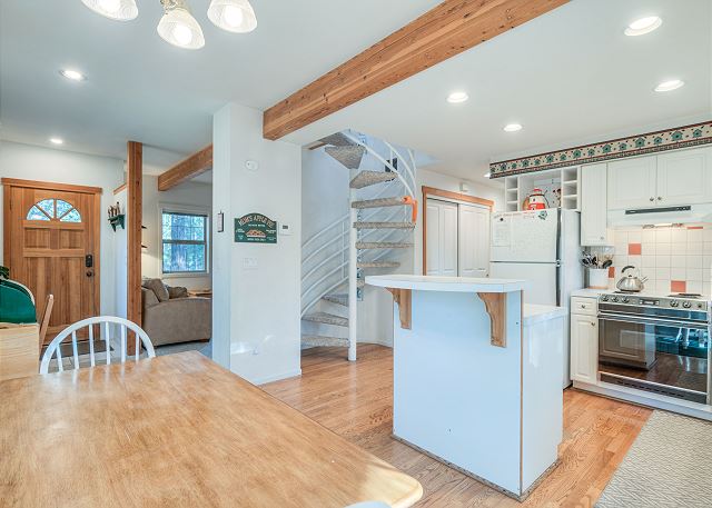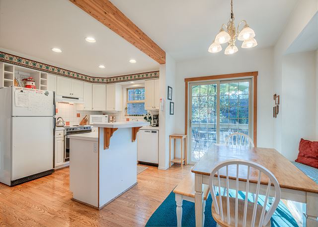 Step inside and feel instantly at home in the cozy living room, located just off the entry. This welcoming space features a warm gas fireplace, comfortable seating, a TV with DVD player, and a queen hide-a-bed, making it an ideal spot to relax after a day of Sunriver adventures. Gather with loved ones for movie night or unwind by the fire on cooler evenings. The well-stocked kitchen includes a convenient island and opens to the dining area, creating an easy flow for meals and conversation. Step out onto the private deck to enjoy the gas BBQ or sink into your private hot tub, perfect for stargazing and relaxation.