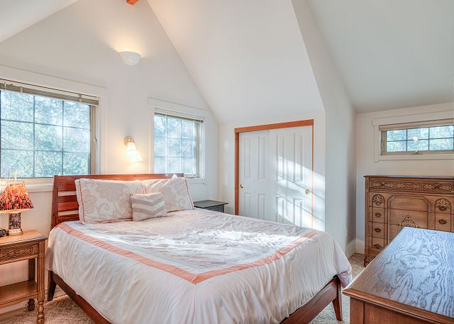 A charming spiral staircase leads to the upper level, where you’ll find two beautifully appointed bedrooms with Victorian-inspired décor. The primary bedroom features a king bed and its own TV, while the second bedroom offers a comfortable queen bed. Both bedrooms share a Jack-and-Jill bathroom with private vanity areas, providing added comfort and convenience.