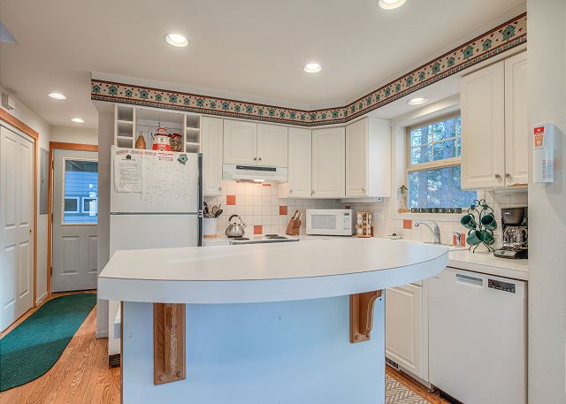 Full Kitchen, Refrigerator, Drip Coffee Maker, Microwave, Toaster, Cookware, Blender, Dishwasher, Oven, Kitchen Island, Kettle, Stove, Kitchen towels, Hot Pads, Hand Mixer, Can Opener