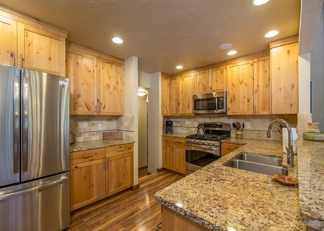 The well-appointed kitchen is perfect for preparing family meals. With a gas range and beautiful countertops, cooking here is a joy.