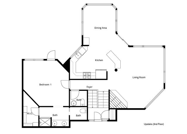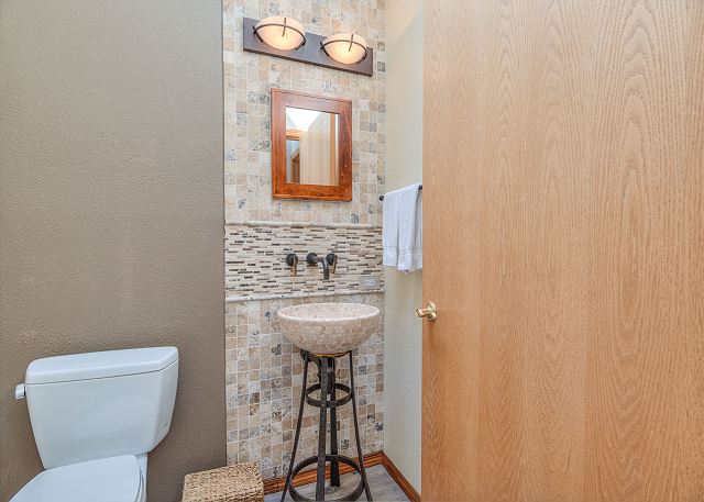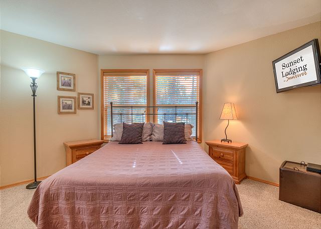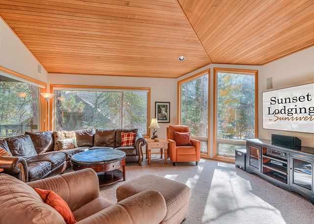 On the upper level, enjoy a bright and inviting living room with vaulted ceilings and large windows that fill the space with natural light. The stunning river rock fireplace is the heart of the home—perfect for cozy evenings after a day of adventure. A large flat-screen TV with cable makes family movie nights easy and fun.