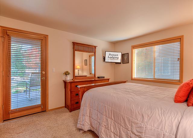 Bedroom 3: Queen bed, TV with cable, and private patio access with rocking chairs for morning coffee.