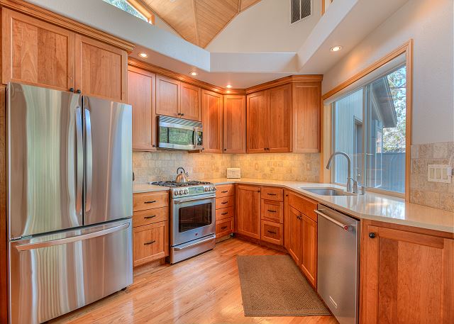 Full Kitchen, Refrigerator, Drip Coffee Maker, Microwave, Toaster, Cookware, Blender, Dishwasher, Oven, Kettle, Stove, Highchair, Griddle, Waffle Maker, Kitchen towels, Hot Pads, Bakeware